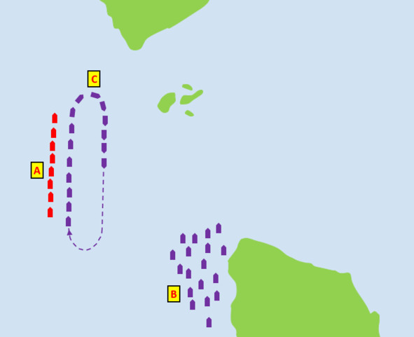 А – авангард британского флота; В – тыловая часть французского флота; С – пятнадцать французских кораблей выполняют «эллиптическую карусель», периодически обстреливая британцев