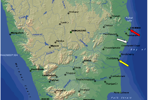 Мадрас (красная стрелка), Каддалор (желтая стрелка), Садрас (белая стрелка)