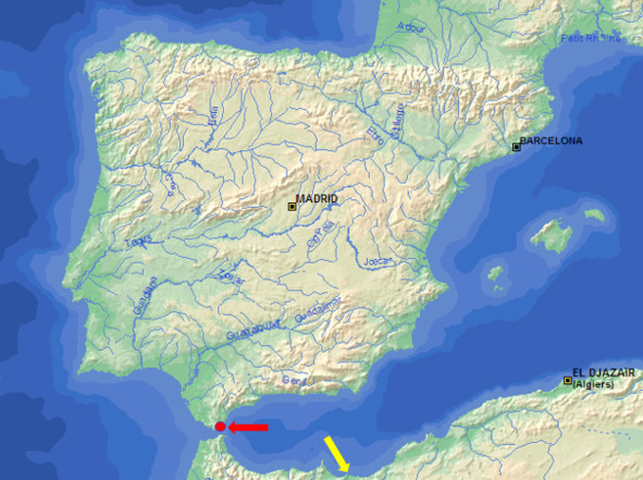 Чафаринские острова (желтая стрелка), Гибралтар (красная стрелка)
