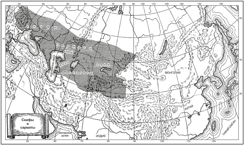 В анналах истории значится, что на смену киммерийцам пришли собственно скифы. Из греческих хроник ясно следует, что эти скифы первоначально обитали в Северном Туркестане[9] и были вынуждены мигрировать только под давлением кого-то из своих соседей. В письменных исторических источниках они появились, когда, покинув Туркестан, сами вытеснили киммерийцев и сделались хозяевами степных земель Южной России. Существуют сомнения по поводу точного времени их завоеваний. Известно, что в VII в. до н. э. скифы уже хозяйничали в степях Южной России, но вполне возможно, что их миграция в этот регион имела место, как минимум, за один или два века до этого.