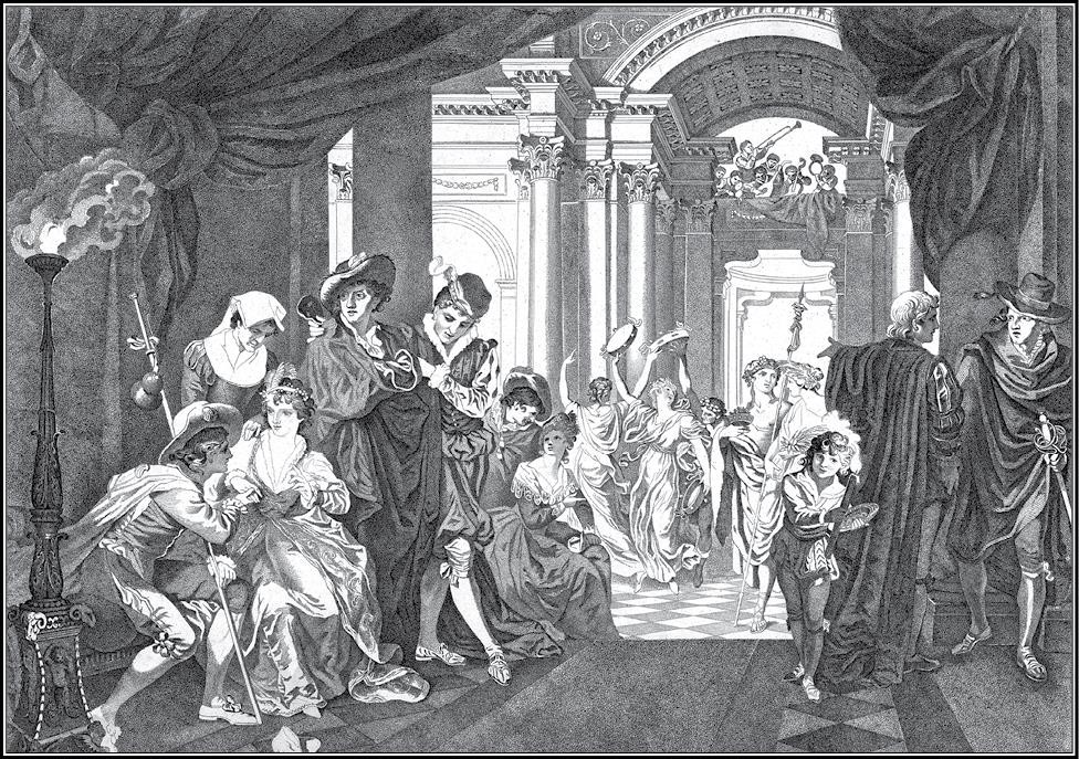Привет, мои синьоры! Было время,Я тоже маску надевал и нежноШептал признанья на ушко красотке;Но все это прошло, прошло, прошло.Привет мой вам! – Играйте, музыканты. –Эй, места, места! – Ну же, в пляс, девицы!Музыка; гости танцуют.