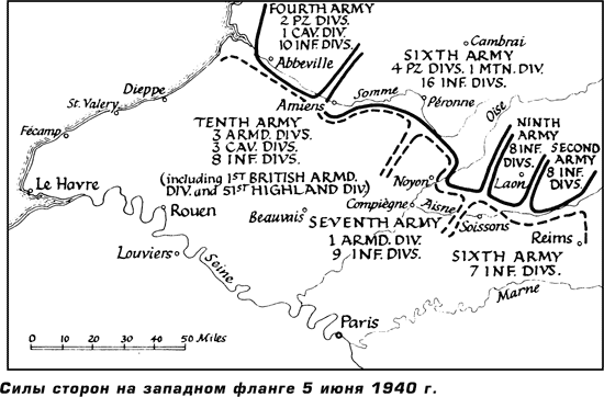 Французская 10-я армия, включавшая этот английский контингент, пыталась удерживать линию Соммы. Одна лишь 51-я дивизия занимала фронт протяжением 16 миль, и остальная часть армии находилась в таком же напряженном положении. 4 июня вместе с французской дивизией и французскими танками она атаковала немецкий плацдарм у Абвиля, но без успеха. 5 июня начался последний этап битвы за Францию. Французский фронт состоял из 2, 3 и 4-й групп армий. 2-я группа обороняла Рейнский фронт и линию Мажино. 4-я стояла вдоль Эны; а 3-я – от Эны до устья Соммы. 3-я группа армий включала 6, 7 и 10-ю армии; в состав 10-й армии входили все английские силы во Франции. Вся эта огромная линия, которую занимали в тот момент почти полтора миллиона человек, или около 65 дивизий, должна была подвергнуться нападению 124 немецких дивизий, которые также образовали три группы армий, а именно: береговой сектор – Бок; центральный сектор – Рундштедт; восточный сектор – Лееб. Эти группы атаковали соответственно 5, 9 и 15 июня. Ночью 5 июня мы узнали, что немцы утром предприняли наступление на фронте протяжением 75 миль от Амьена до дороги Лаон – Суассон. Это была война в крупнейшем масштабе.