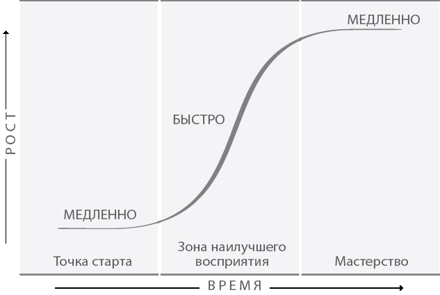 А это, в свою очередь, наводит на следующую мысль: S-образная кривая также может помочь нам понять основы личностного роста[6]. Модель, которая раскрывает процесс изменений в группах людей, неразрывно связана с развитием отдельных людей. Предстоит провести еще немало исследований, но результаты в области биологии, психологии и неврологии, наряду с нашими качественными данными, подкрепляют мою гипотезу: S-образная кривая обучения представляет собой микромир кривой диффузии инноваций.
