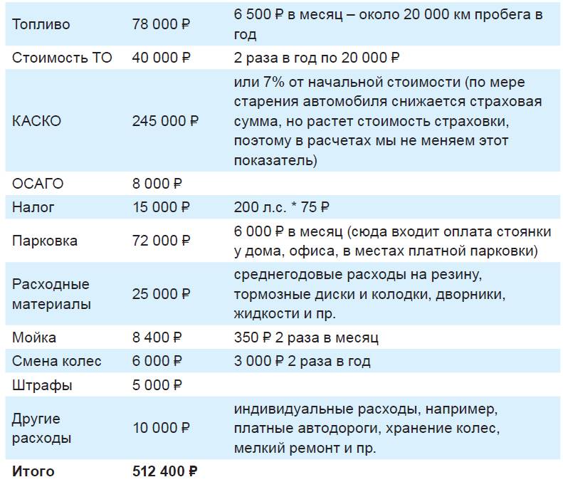 Рассмотрим в качестве примера приобретение автомобиля стоимостью 3,5 млн ₽, а также сколько будет потрачено на его эксплуатацию в последующие 10 лет (при проведении операции трейд-ин через 5 лет придется добавить еще 2,3 млн ₽ для обмена на новый автомобиль). Рассмотрим параметры, определяющие размер ежегодных расходов на эксплуатацию автомобиля.