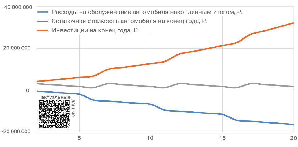 На графике и в таблице приведены изменения стоимости автомобиля, накопленный итог расходов на содержание автомобиля и трейд-ин, а также суммы инвестиций с учетом роста активов и дополнительных взносов (расходы на содержание автомобиля минус расходы на перемещение на такси и общественном транспорте).