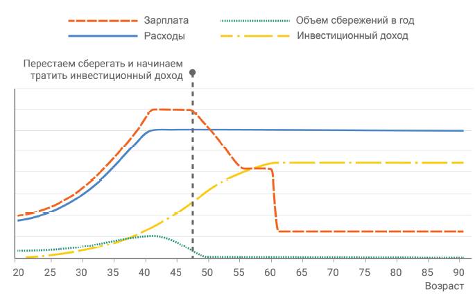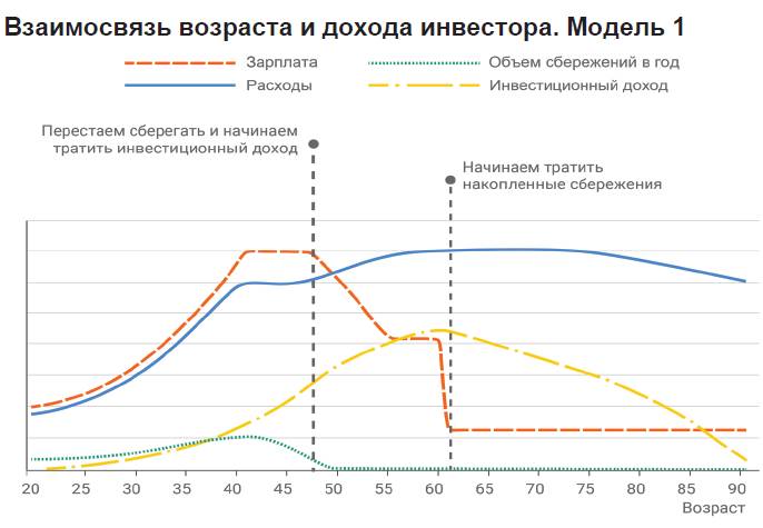 Первая модель предполагает расходование инвестиционного дохода и сделанных ранее сбережений за предполагаемый период жизни.