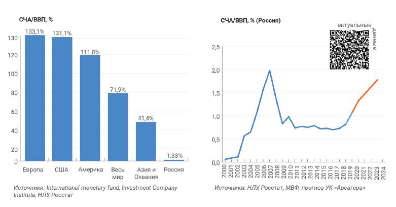 В странах с высоким уровнем жизни населения большая часть жителей инвестирует именно посредством инвестиционных фондов. Приведенные далее графики показывают соотношения размера стоимости чистых активов (СЧА) фондов к ВВП страны. По данному соотношению (СЧА/ВВП) можно судить об инвестиционной активности населения.