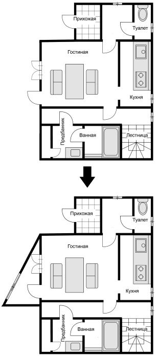 Курихара: Итак, эта трапеция – участок. На нем стоял дом вот такой формы. На свободном треугольном участке земли, скорее всего, разбили сад. Веранды ведь не было, поэтому наверняка вещи после стирки развешивали сушиться именно в саду. Но потом по какой-то причине хозяевам потребовалось сделать пристройку. Тогда и появилась эта комната. А нестандартная форма объясняется тем, что ее нужно было вписать в незастроенный участок земли.