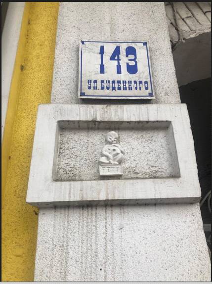 Снаружи же, с улицы Буденного, и до того, как проникнешь за решетку закрытых жильцами на замок ворот, тети Катин дом выглядел гораздо более внушительно: дореволюционная основательная постройка, добротная и прекрасно сохранившаяся белая кирпичная кладка, фрагментами оштукатуренная в благородный желтый. И даже прямоугольный барельеф на входе – сидящий мальчик, вроде бы, с черепом в руках. Впечатляюще!