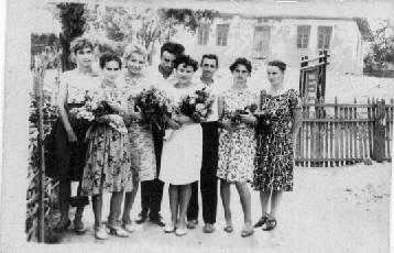 Свадьба одной из медсестер унцештской больницы, 1963. Слева направо: Лиза (медсестра), акушерка по фамилии Поя, Валентина Резникова (медсестра, моя вторая жена), жених и невеста, медбрат, Галя (лаборантка), Надя (медсестра больницы)