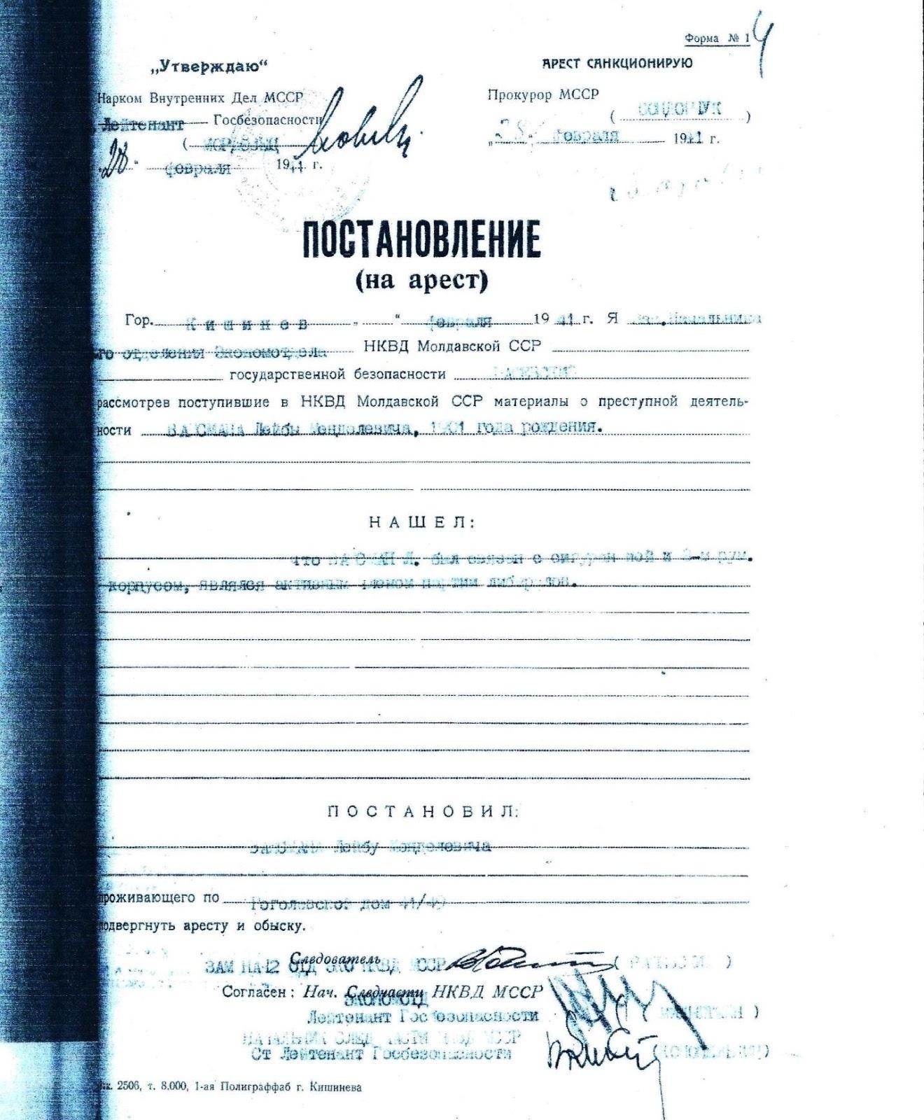 Лев Вайсман был арестован 28 февраля 1941 года. Согласно постановлению на арест, приведенному ниже, в НКВД Молдавской ССР поступили материалы о его преступной деятельности, а именно его связи с сигуранцей (тайной румынской полицией) и 3-м румынским корпусом и активное членство в партии либералов.