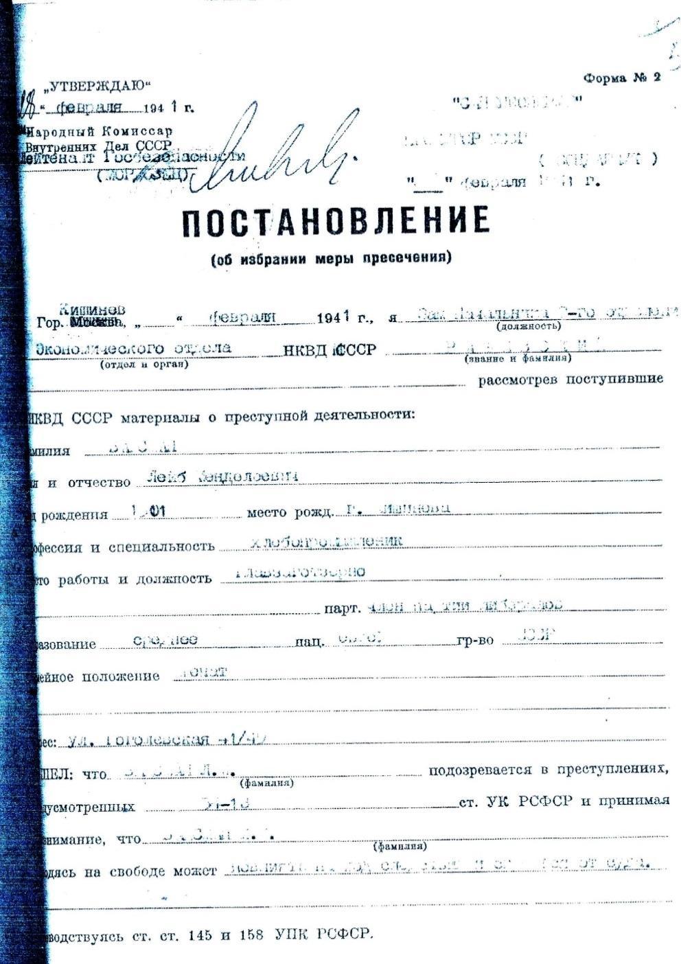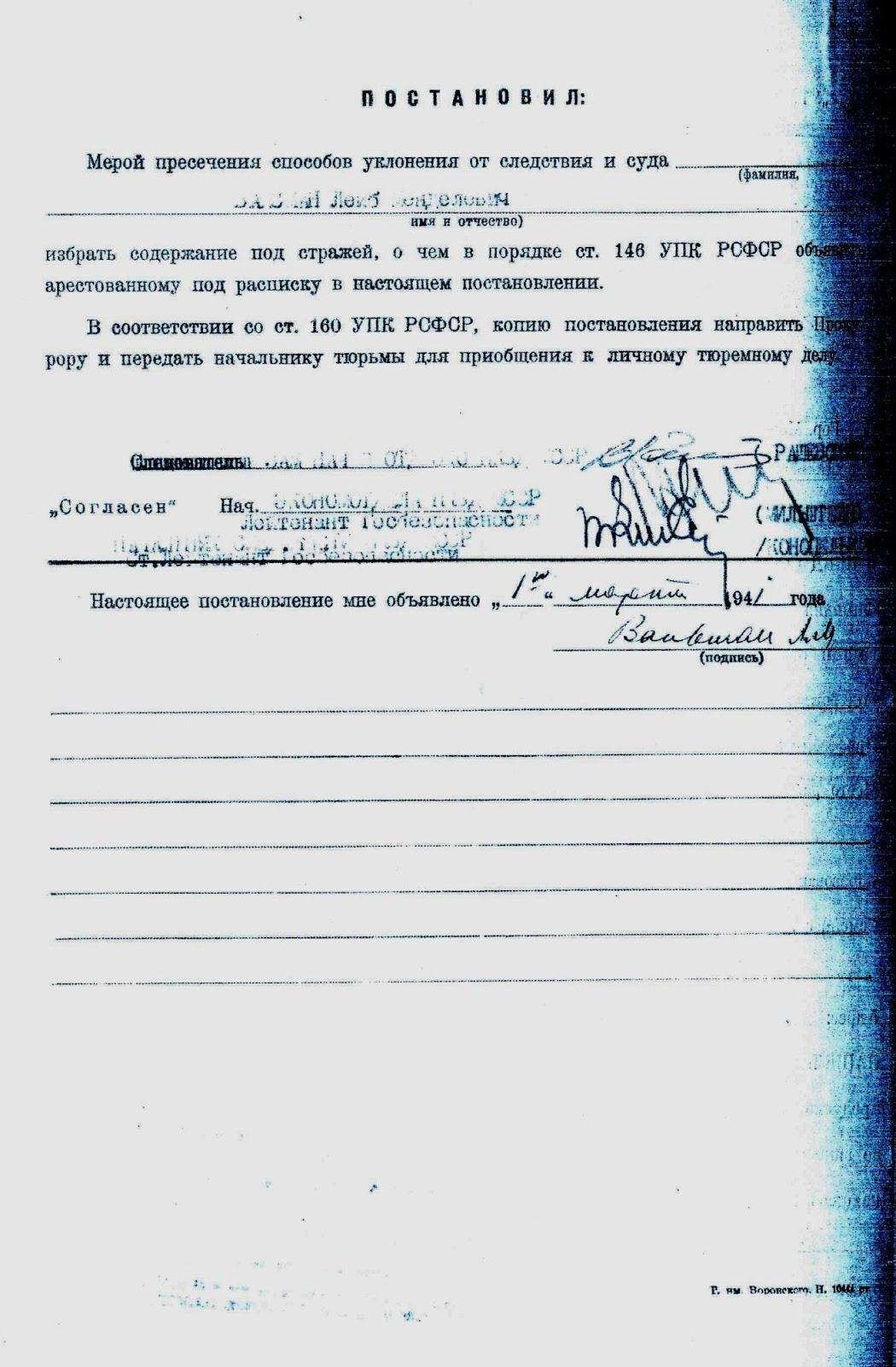 4 марта 1941 года младшим лейтенантом госбезопасности Грошниковым было подписано постановление о начале следствия.