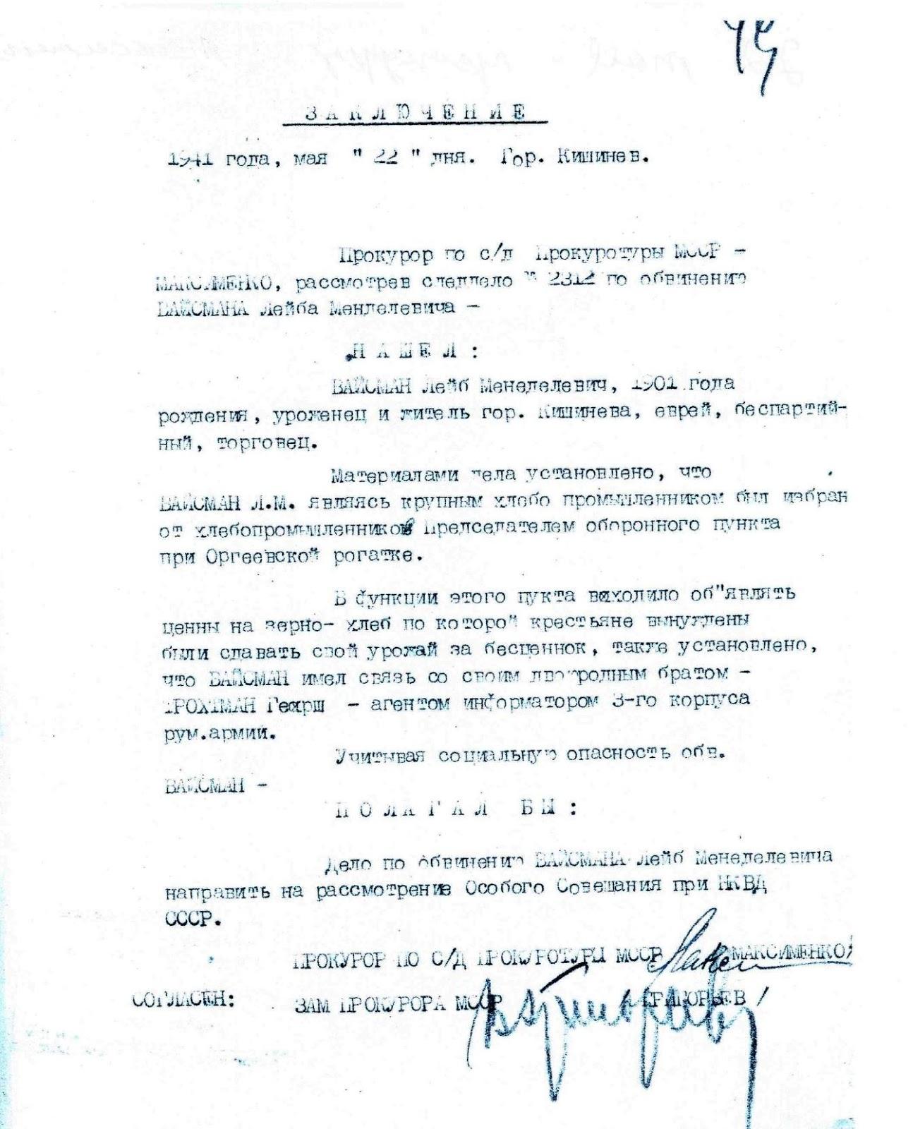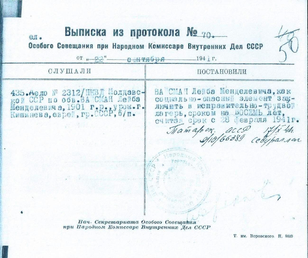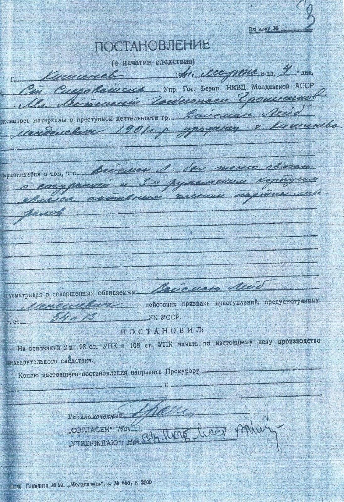 Постановление было подписано заместителем начальника экономического отдела НКВД Молдавской ССР Рашевским.