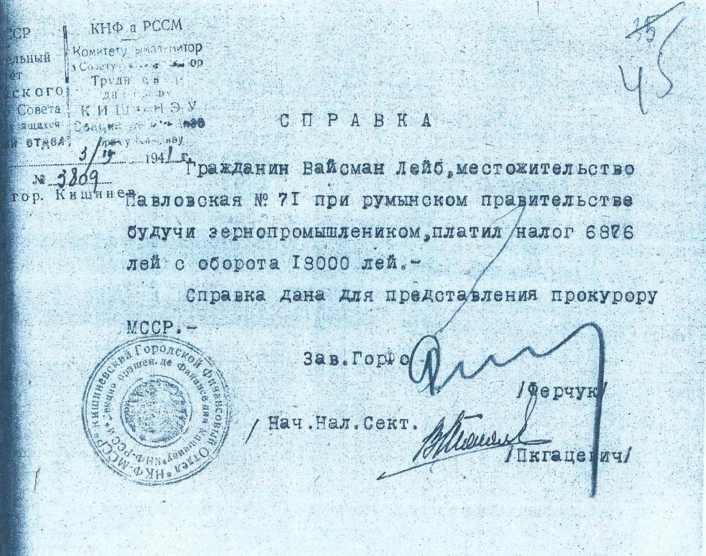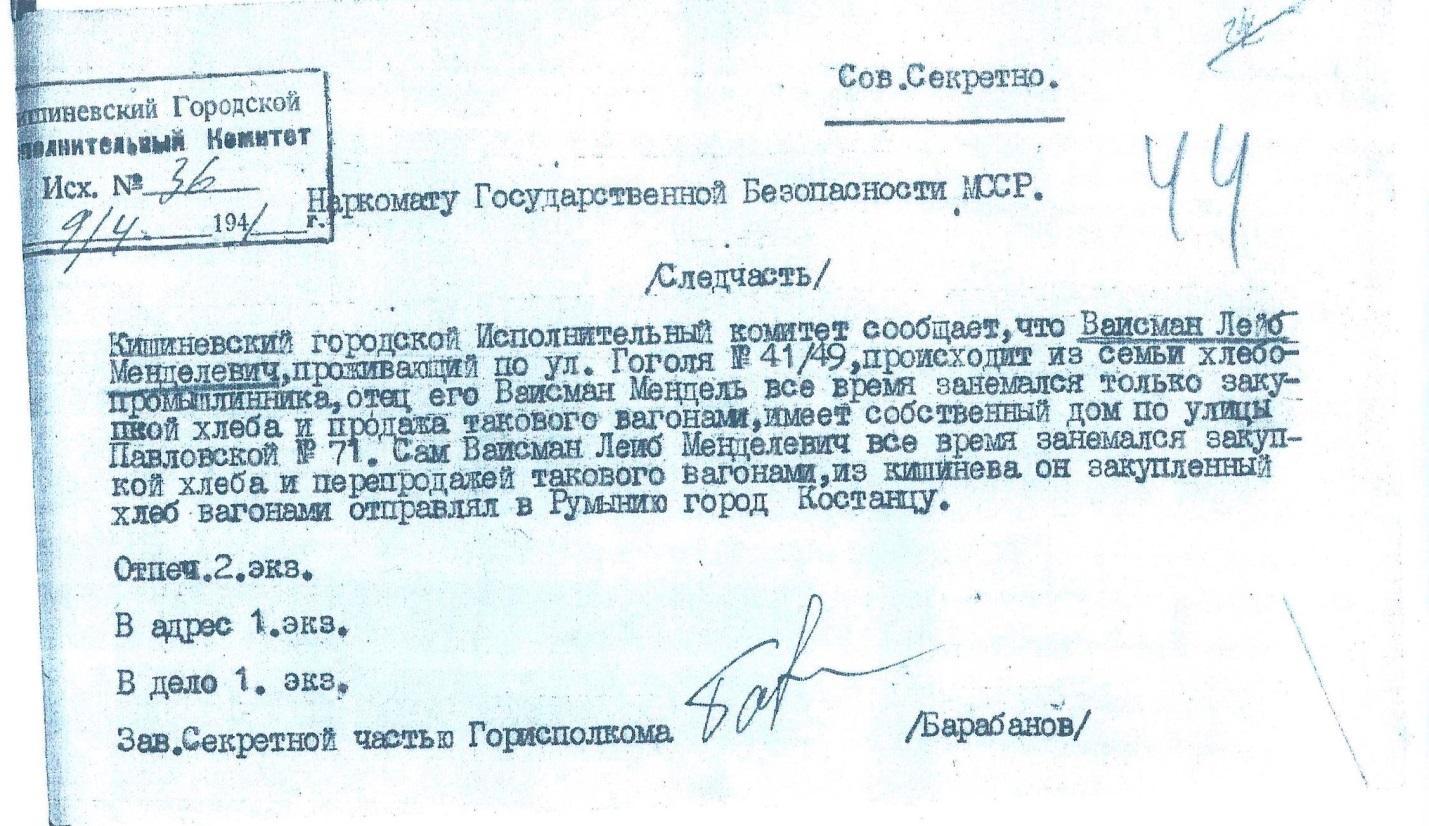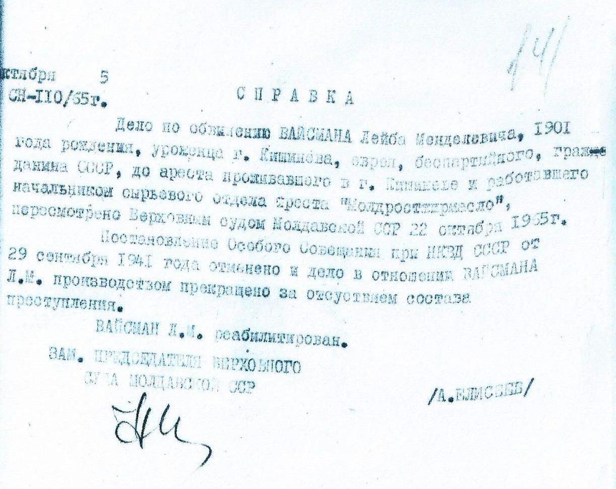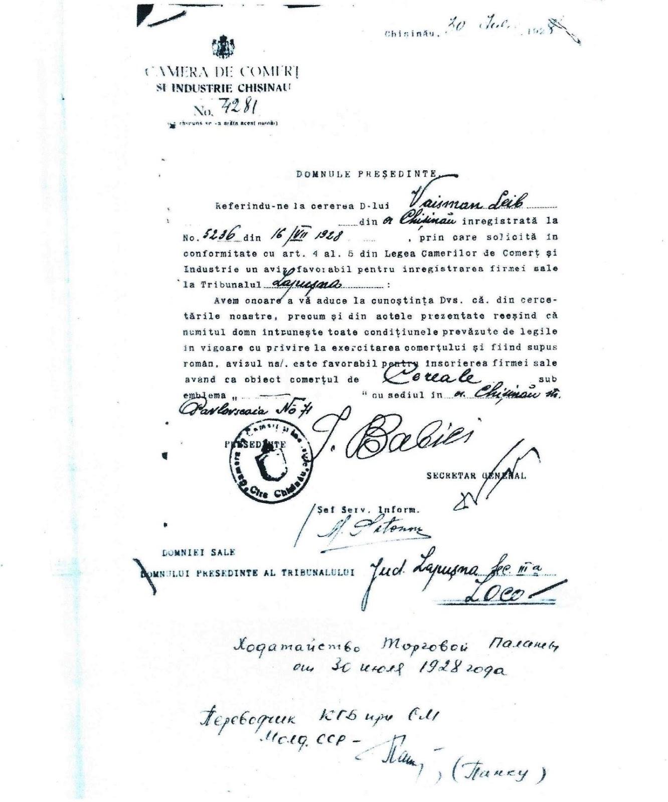 так и к 1965 годам. Среди документов 1965 года были переводы (с румынского языка) архивных справок торговой палаты и трибунала Лопушнянского уезда Кишинева, которые подтверждали регистрацию Львом Вайсманом 17 декабря 1928 года собственной фирмы по продаже зерна с резиденцией по улице Петра Рареша 71 в Кишиневе.