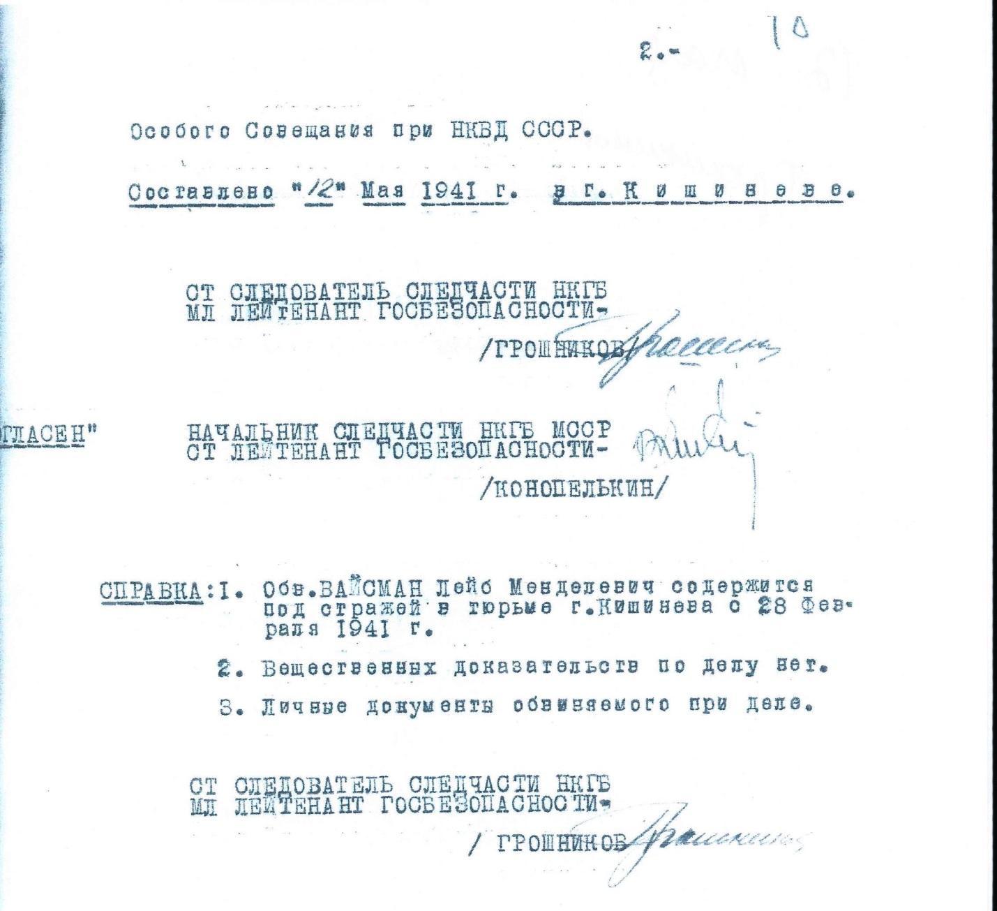 Из следующего документа от 12 мая 1941 года видно, что на 12 мая 1941 следствие не располагало никакими вещественными доказательствами по делу Вайсмана.
