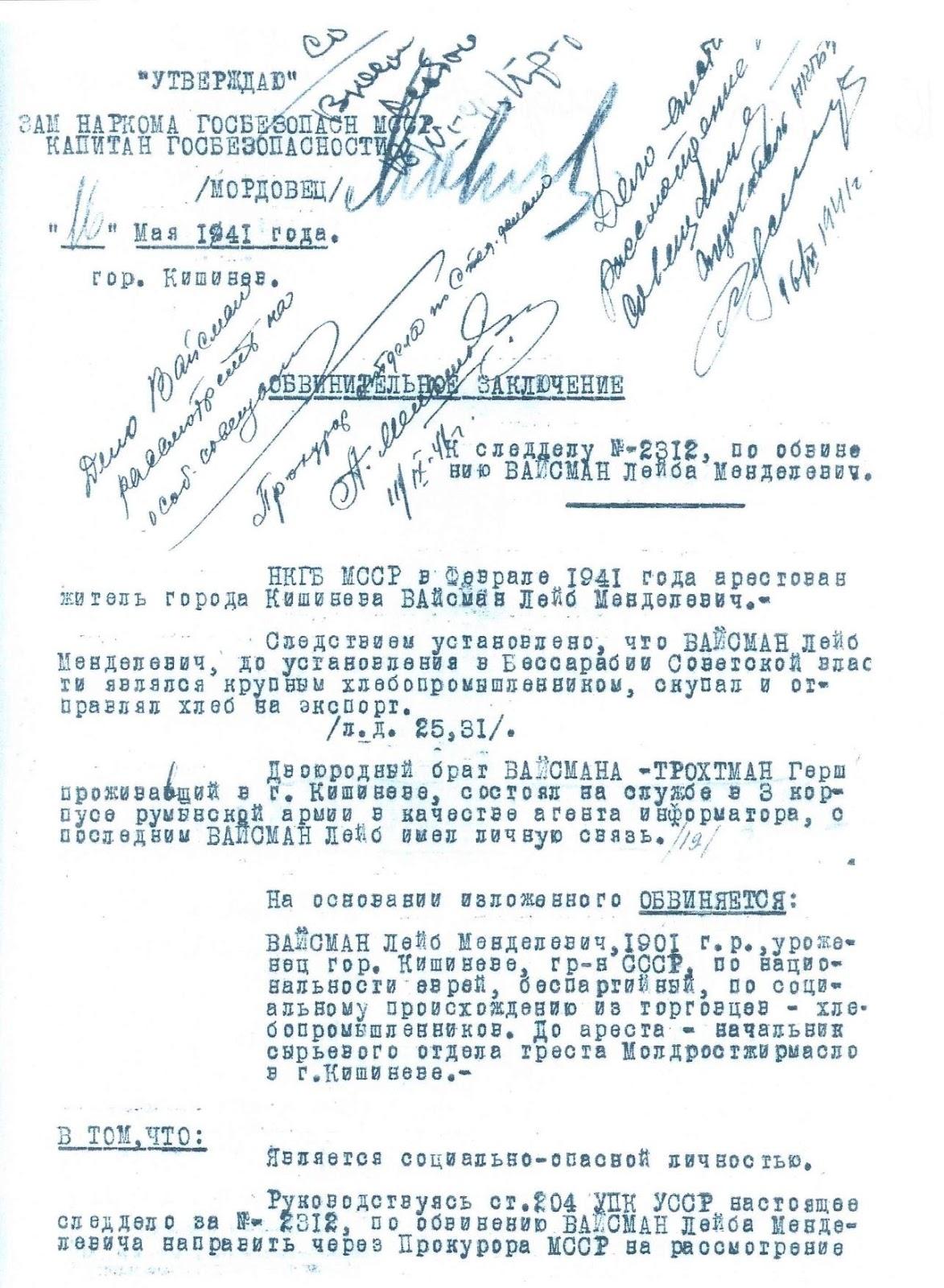Несмотря на то, что доказательств «преступной деятельности» найдено не было, уже буквально через 3 дня замнаркома госбезопасности МССР Мордовцем, было подписано обвинительное заключение, которое делало Вайсмана социально-опасным на основании 2 пунктов: