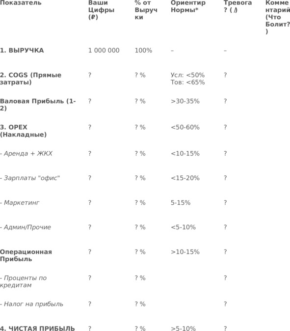 Аренда> 10—15% от Выручки → «Тяжелая гиря на ногах». Неоправданная роскошь или плохой договор.