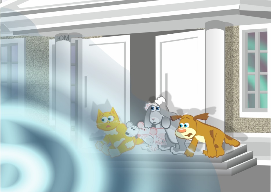 Зверята наблюдали за профессором, выглядывая из-за кустов. Когда Борис Иванович отдалился на приличное расстояние, зверята побежали к зданию и быстро на четвереньках вскарабкались по ступенькам. Они почти ползком устремились к двери и тут услышали: