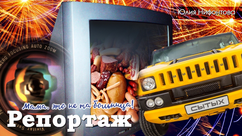 СТЕНДАП*(спец. – журналист подготовивший сюжет, сам говорит в кадре): Мы ведём наш репортаж с похорон залуженного чемпиона по булемии* (болезнь – нарушение пищевого поведения) Вадика Сс-сытых. (журналюга – змей, намеренно искажает фамилию героя, павшего в неравном бою с чревоугодием). На момент долгожданной жителями края кончины, Вадик Сс-сытых весил более трёхсот килограмм.