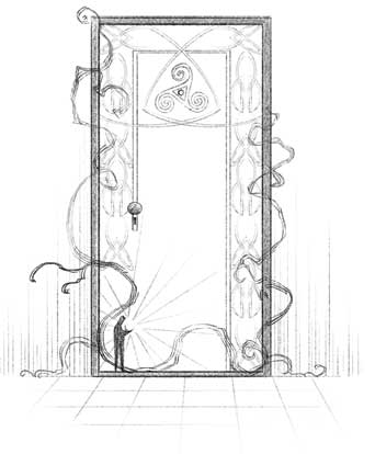 Макс перевел взгляд направо и только сейчас заметил зеленую дверь, обвитую искусственным плющом, слишком похожую на дверь с его тетради. А внизу, в самом уголке, был нарисован черный силуэт человечка, который держал в руках солнце. Макс проследил взглядом до замочной скважины, и еще выше – до символа трискелиона, который витиеватым узором украшал глазок.