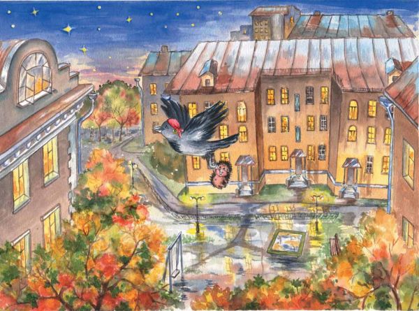 Так он и сидел, не шевеля ни одной лапкой, пока они не затекли. Тогда Ёжик высунулся из своего укрытия, чтобы размять лапы и поболтать со знакомой звездой. И тут же был замечен огромной Вороной. Ворона была местной знаменитостью на детской площадке, потому что всегда высматривала всё, что плохо лежит. В этот раз плохо лежал Ёжик. Ворона, недолго думая, схватила его за лапку, взлетела высоко в небо и направилась на свой роскошный чердак, который стороной обходили все местные коты.