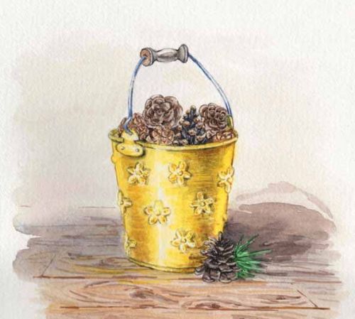 В один дождливый день Ворона принесла маленькое железное ведёрко жёлтого цвета, которое было украшено фигурными цветочками. Ёжик очень обрадовался такой находке и предложил Вороне сложить в него разбросанные по чердаку шишки. Но одного ведёрка им не хватило, и друзья решили непременно найти ещё одно такое же замечательное ведро.