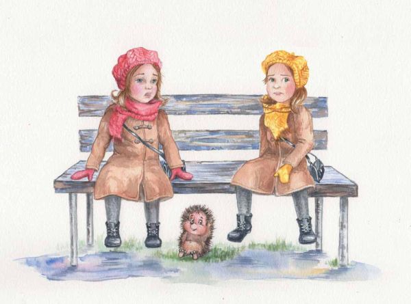 Ёжик обежал все соседние дворы, но ничего похожего на ведёрко так и не нашёл. Он порядком устал и присел под скамейкой отдохнуть, вытянув лапки. А прямо на скамейке сидели две девочки. Они были удивительно похожи друг на друга, мама почему-то называла их Клюквами. Они были чем-то очень расстроены. Ёжик невольно подслушал их разговор: