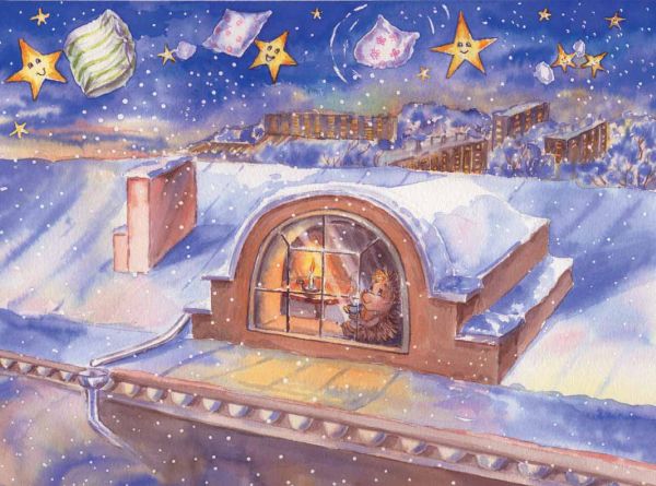 За окном тем временем началась самая настоящая метель! Снег падал с неба на землю огромными хлопьями, будто звёзды сговорились, и все одновременно начали кидаться подушками, набитыми снегом. И из подушек вместо перьев на землю сыпался снег. Так думал Ёжик, сидя на чердаке и растирая подмёрзшие лапки.