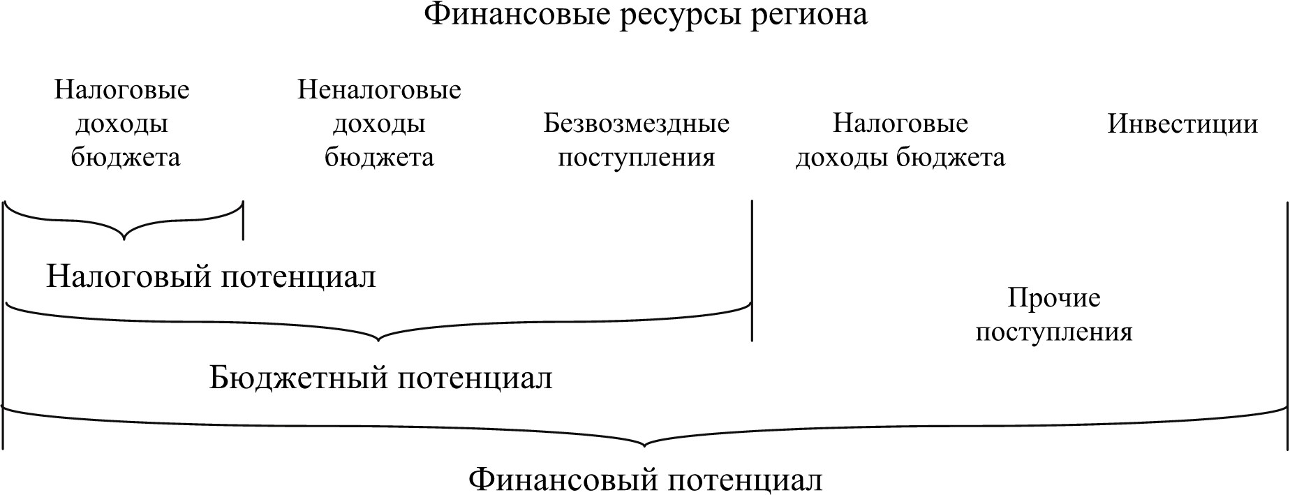 Финансовый потенциал включает в себя совокупность всех финансовых ресурсов, т. е. денежных средств, которыми располагает регион, его предприятия, организации, учреждения как хозяйствующие субъекты для покрытия своих затрат. Данный перечень ресурсов включает в себя все налоговые поступления, зачисляемые в федеральный, региональный и местный бюджеты; средства предприятий, в том числе чистую прибыль; средства негосударственных фондов, общественных объединений и некоммерческих организаций; средства населения в сбережениях; доходы региона от предпринимательской деятельности; финансовые средства, уходящие за пределы региона в виде инвестиционных потоков, безвозмездных поступлений в федеральный бюджет и др. Таким образом, в состав финансового потенциала могут входить финансовые ресурсы, которые в рамках принятой в государстве налоговой системы либо вообще не составляют объект налогообложения (чистая прибыль предприятий), либо попадают под налогообложение частично (инвестиционные потоки, средства населения в сбережениях) [60].