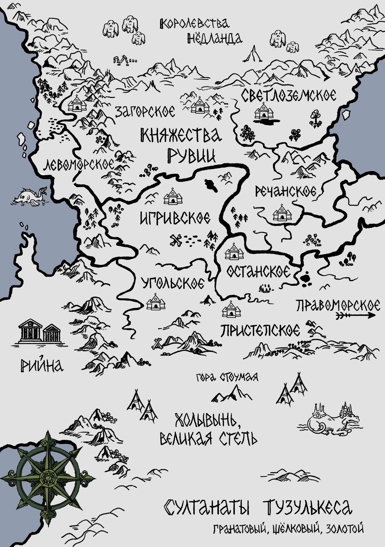 Левоморье – на запад, Правоморье – на восток. Загорье – на север. Сребрые горы в Левоморском княжестве. Царица-река матушка Игрива – в средине всего. Гора Стоумая – сердце Степи, на юг.