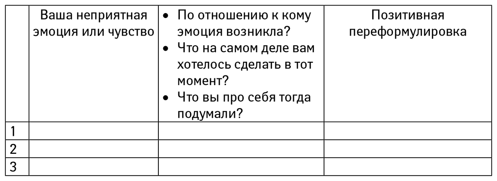 А теперь просто переформулируйте ваши переживания в позитивном ключе. Как бы отвечая на вопрос: а что на самом деле вы хотели в момент возникновения этой эмоции?
