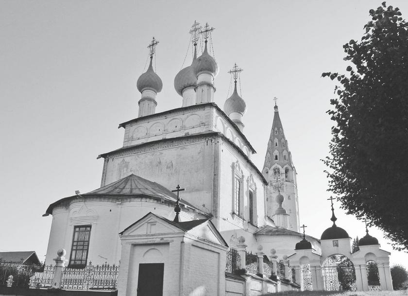 На фоне синего неба серо-голубой цвет Крестовоздвиженского храма смотрится особенно нежным. Храм в стиле нарышкинского барокко возведен на средства жителей в 1762–1774 годах мастером Егором Дубовым. Роспись внутренних помещений закончили к 1807 году, фресковая живопись выполнена палехскими мастерами под руководством братьев Сапожниковых, владельцев иконописной мастерской в Москве. Храм устоял в годы советской власти благодаря хитрости жителей: они обратились в Наркомпрос РСФСР с просьбой о включении храма в экспозицию музея. Весной 1936 года имущество Крестовоздвиженского храма, в том числе и древние иконы, было передано Государственному музею палехского искусства, что, собственно, и спасло храм и всё его содержимое.