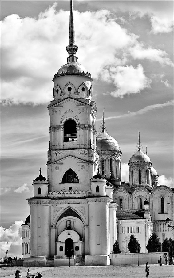 Но не прошло и 25 лет, как храм сгорел в сильнейшем пожаре 1185 года. Новый князь, младший брат Андрея Боголюбского и десятый сын Юрия Долгорукого Всеволод III, (прозванный потом за большое количество детей Большим Гнездом), решил не сносить обгоревшее здание, а перестроить, городу нужен был большой храм. Таким он и дошел до наших дней с 1186–1189 годов почти без изменений. Почти – потому что в 1810 году перед храмом построили колокольню, а в 1862 по проекту Николая Артлебена соединили колокольню с храмом Георгиевским приделом, а в конце XIX века пять луковичных глав заменили шлемовидными и убрали массивные контрфорсы, оставшиеся только на старинных гравюрах.