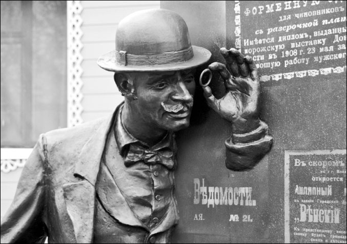 На информационной табличке рядом со скульптурной композицией указано, что мужчина – «доблестный сотрудник сыскной полиции» – ведет «наружку» за владимирскими шалопаями, которые «промышляли» в центральной торговой части дореволюционного Владимира, хотя основной их задачей была слежка за неблагонадежными.