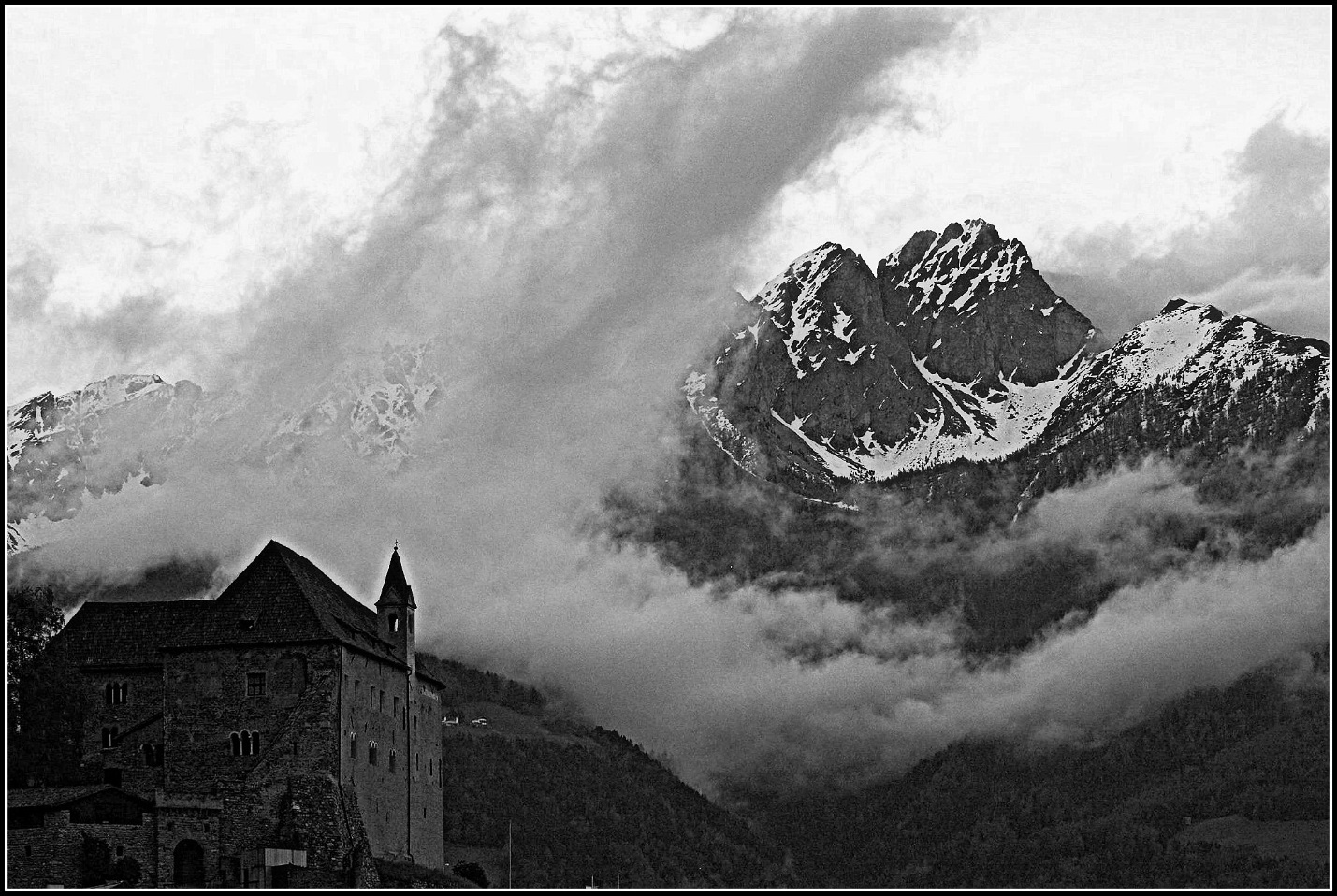 Высокая часовая башня, примыкающее к ней средневековое здание из серого камня, подвесной мост с мраморными рыцарями по обе стороны входа, внутренний двор и дикий пар вокруг.