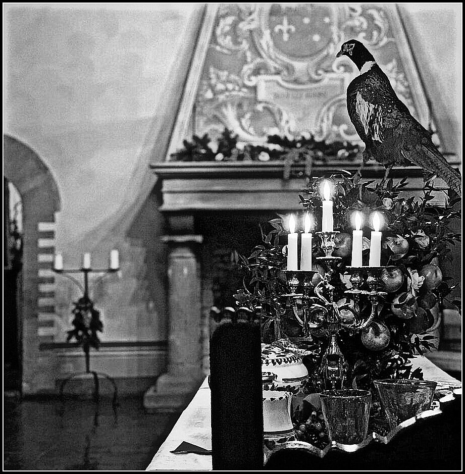 Неожиданно сильный порыв ветра распахнул двери на террасу, ветер пронесся по гостиной, затушил свечи, вместе с ними погасли и люстры. Загрохотал гром и ярко вспыхнула молния.