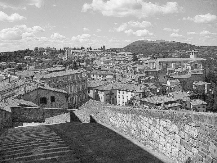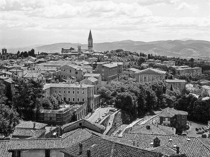 Стоишь посреди широкой оживленной улицы, но бросишь взгляд в сторону, в проем между домами – и перед тобой умбрийские холмы. Дух сельской Умбрии царит практически в центре города. Тут и там торчат старые колокольни церквей, а посреди всей этой красоты снуют толпы молодежи всех национальностей, это студенты знаменитого университета для иностранцев.