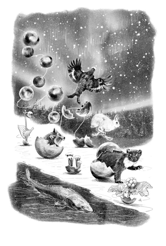 …Митри долго шел вдоль реки и захотел есть. Он вспомнил, как отец говорил: «Матушка Земля не даст путнику погибнуть. У нее всегда можно попросить, и она накормит». И тотчас увидел полянку, а на ней морошку – самую первую ягоду, которая поспевает на севере. Рядом краснела прошлогодняя клюква: она уходит под зиму и весной не теряет ни упругости, ни пользы. Вдоволь наелся маленький путник, соорудил подстилку из сухих сосновых веток, прилег и заснул.