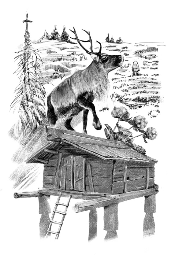 Маленький Митри посмотрел на своего друга, но Эви и без того знал: сам погибай, а попавшего в беду выручай! Сначала надо было отвести воду, поменять русло. Эви стал бить копытами о сырую землю, копыта у северного оленя сильные, даже ледяную корку разбивают. А воду надо только чуть направить, и дальше она сама пробьет себе дорогу. Много ли прошло времени, мало ли, но вдруг река сдалась. Она как будто остановилась, задумалась и стремительно потекла по выбитой бровке. Вода ушла, олени были спасены, но как маленькому мальчику вытянуть взрослого мужчину из болота? Митри и березу пытался наклонить, и тянуть отца за руки, но, увы, силенок никак не хватало.