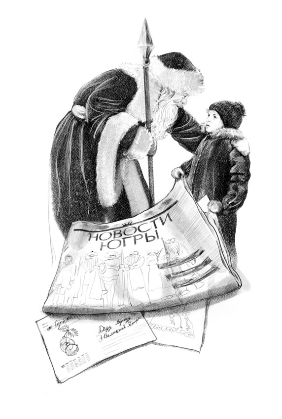 Сережа нахмурился, разложил перед собой улики и еще раз внимательно посмотрел на них: конверт новогодний, подписанный крупными неровными буквами «Деду Морозу в Великий Устюг»; листок с непонятными каракулями и рисунком, на котором с трудом можно было разобрать что-то с колесиками; газета «Новости Югры», мятая и скомканная, сложенная вчетверо. Как сверхсекретный агент перед выполнением задания, сосредоточенно и неторопливо, мальчик стал расталкивать таинственные бумаги по карманам пуховика. Мама давно его торопила: они опаздывали на веселую встречу со всеми Дедами Морозами и Снегурочками у костра. Это был последний вечер Съезда Дедов Морозов и Снегурочек, после него они уедут из Ханты-Мансийска и вернутся только через год. Обычно Сережа радовался и не мог дождаться этого сказочного вечера, но только не сегодня.