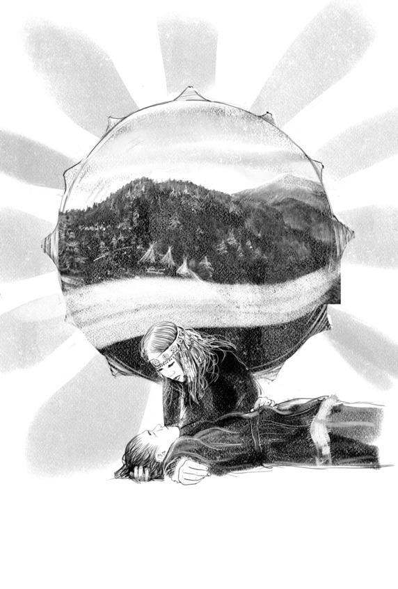 Неожиданно все закончилось так же быстро, как и началось. Небо просияло, выглянуло солнце, но люди все еще боялись выйти из своих чумов. Шаман лежал без сознания на мокрой горячей земле неподалеку от жилища. Над его телом безудержно причитала и плакала жена. В это время высоко в небе Нуми-Торум услышал громкий плач матери. Она кричала от боли, просила и умоляла небесного бога услышать ее и прийти на помощь, вернуть дочерей домой.