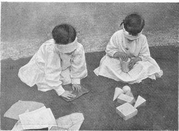 Для развития чувства осязания, кроме гладкой и шероховатой бумаги, приготовлена ещё целая серия лоскутов одинакового размера, разных тканей, аккуратно подрубленных: тут несколько сортов бархата, атласа, тонких и толстых шерстяных, шёлковых, льняных и бумажных тканей. Дети с завязанными глазами угадывают, какая материя попадётся им под руку. На картине № 2 представлены две девочки: одна с завязанными глазами определяет материи, а другая, также с завязанными глазами, определяет геометрические фигуры.