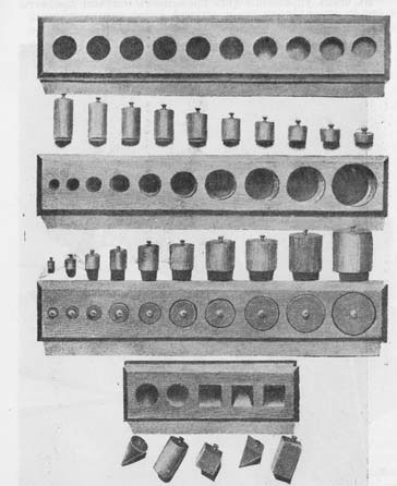 Чувство размера развивается прибором из серии деревянных цилиндров с пуговкой наверху, за которую ребёнок держит эти цилиндры, вкладывая и вынимая их из доски с соответствующими цилиндрам углублениями. В одной серии этой игрушки – все цилиндры имеют одинаковый диаметр, но различную высоту; в другой серии – диаметры различны; в третьей и то и другое различно, и т. д. (карт. № 3).