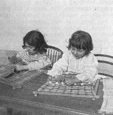 Другое наблюдение натолкнуло Монтессори на мысль об этих подготовительных упражнениях. Оно было вызвано следующим случаем: одна девочка – тоже из её ненормальных воспитанников – никак не могла выучиться шить. Самый простой стежок «вперёд иголку», состоящий в том, чтобы пропустить иголку сначала над, а потом под тканью, захватывая в это время по несколько ниток – был для неё совершенно недосягаем. «Тогда я посадила девочку за фребелевское плетение», – рассказывает Монтессори, – которое состоит в том, что полоска бумаги пропускается в поперечном направлении под и над полосками бумаги, закреплёнными с обоих концов. Мне пришла в голову аналогия между этими двумя упражнениями, и я с интересом наблюдала за девочкой. Когда она научилась фребелевскому тканью, я опять посадила её за шитьё и с радостью убедилась в том, что она стала в состоянии сделать стежок. С этой поры я начинаю обучение шитью с фребелевскего тканья. Я видела, что необходимое для шитья движение руки было подготовлено к шитью без шитья и что, собственно, следует найти способ научить прежде, чем заставить исполнить. Я подумала, что таким же путём можно подготовить и к письму; и эта мысль меня в высшей степени заняла. Меня поразила её простота: как это я прежде не подумала о методе, которую прямо подсказывало наблюдение над девочкой».