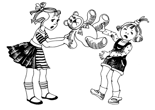 – Я знаю, ты не хочешь отдавать ей игрушку, это твоя игрушка, и несправедливо у тебя ее отбирать. Наверное, она тоже думает, что несправедливо, что ей не дают. Поэтому давай что-нибудь придумаем. Например, можно сделать так. Игрушечка где-то полежит отдельно – ей больно, когда ее тянут в разные стороны. Потом отвлечем маленькую, и ты поиграешь. А потом дашь поиграть ей.
