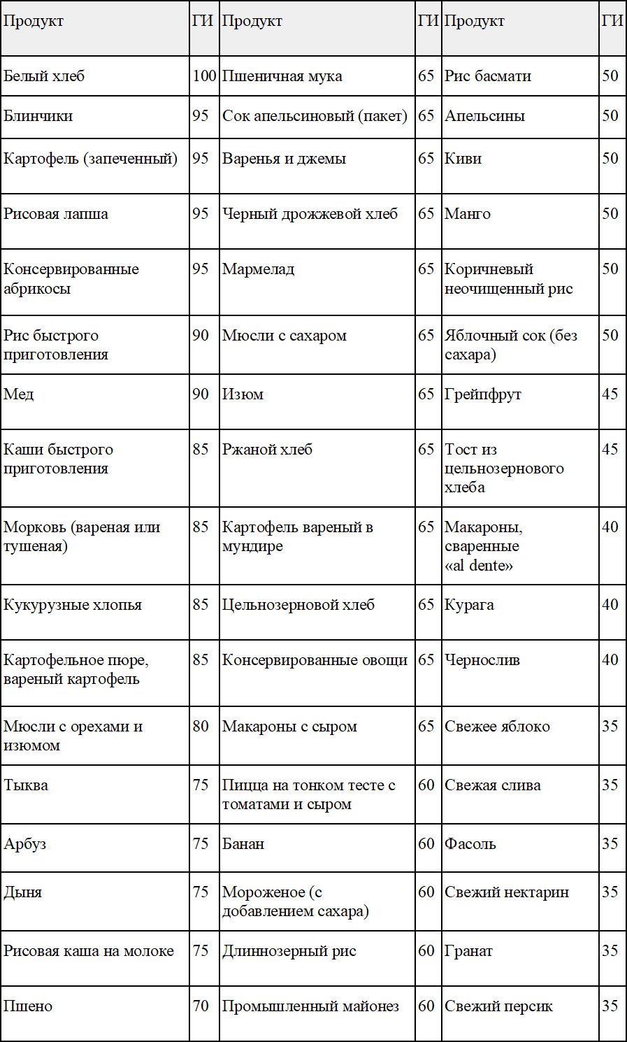 Гликемический индекс (ГИ) – это скорость, с которой содержащиеся в продукте питания углеводы усваиваются организмом и повышают уровень сахара в крови. В нижеуказанной таблице основные продукты питания и их ГИ.