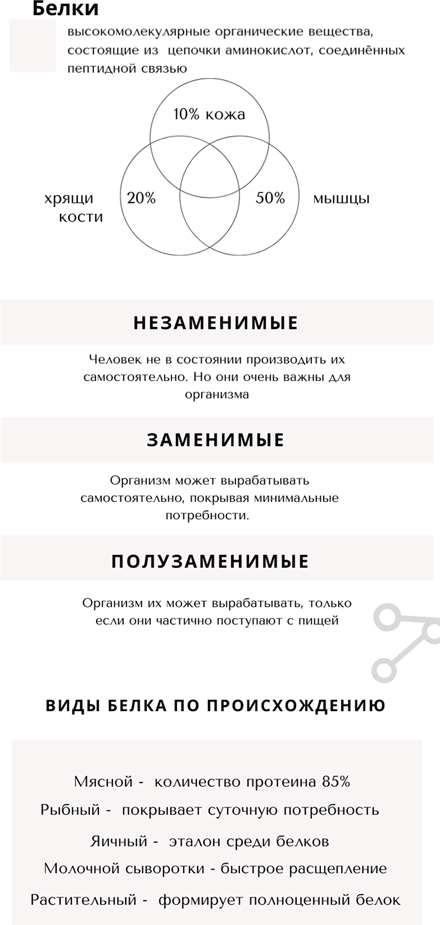 Белки состоят из следующих химических элементов: углерод (50–55 %), кислород (20–23 %), азот (12–19 %), водород (6–7 %), сера (0,2–3,0 %). По структуре протеины разделяют на две большие группы: глобулярные (сферическая форму) и фибриллярные (нитевидная форму). К глобулярным белкам относятся ферменты, иммуноглобулины, альбумины и т. д., к фибриллярным – коллаген, кератин и ряд других.