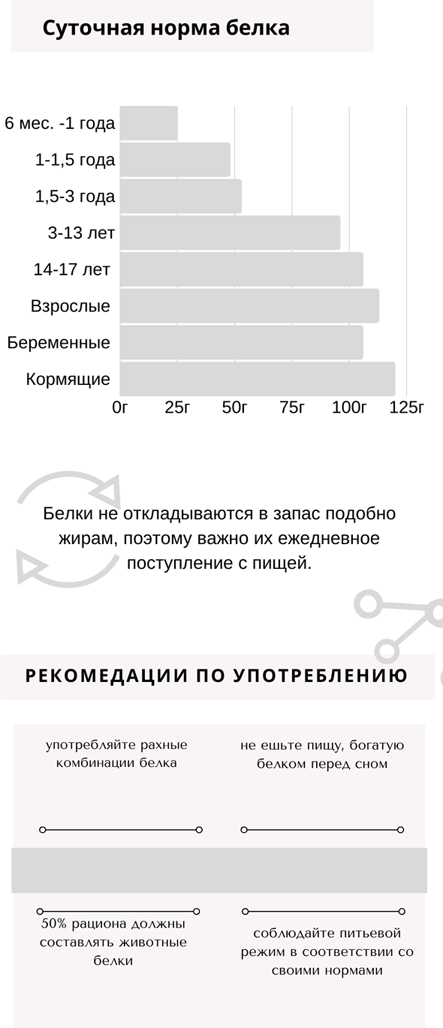 Потребность организма взрослого человека в белке оценивается на уровне от 65 до 117 г/сутки для мужчин, и от 58 до 87 г/сутки для женщин. При этом протеин должен содержать необходимое число незаменимых аминокислот, что обычно достигается равномерным употреблением в пищу как животных, так и растительных белков (например, каша с молоком или мясом). Рекомендуемая в суточном рационе доля протеинов животного происхождения составляет 50 % от общего количества.