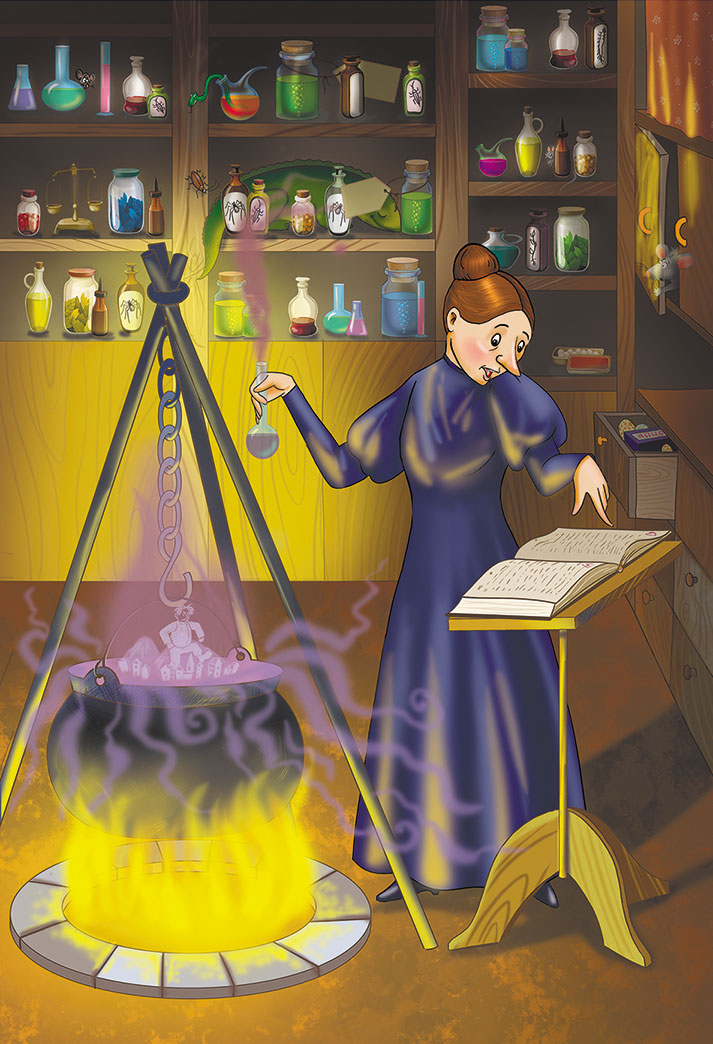 Агата забежала в дом. В голове уже созрел план! Она принялась готовиться к серьёзному колдовству. Поставила треногу, котёл, разложила нужные книжки, долго копалась в корзинках, шкафах, открывала ящички, тщательно выбирала ингредиенты.
