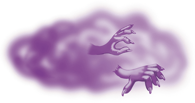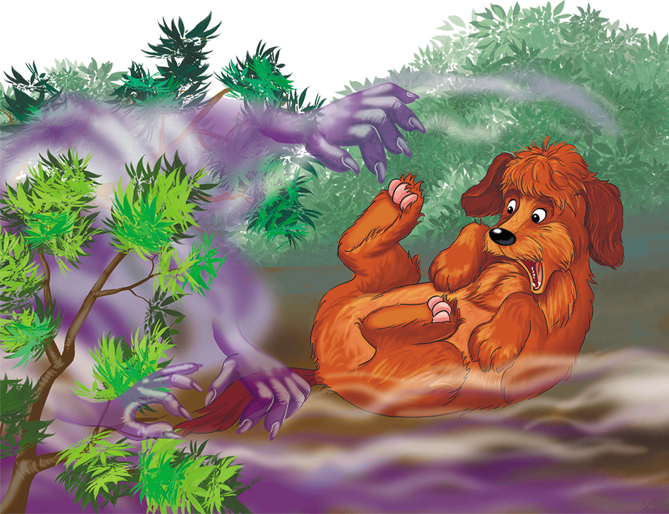 Корявая сиреневая рука вцепилась в его хвост! От неё расползалась сиреневая мгла, которая стелилась между деревьев. Кое-где такие же жуткие руки держались за кусты и ветки.